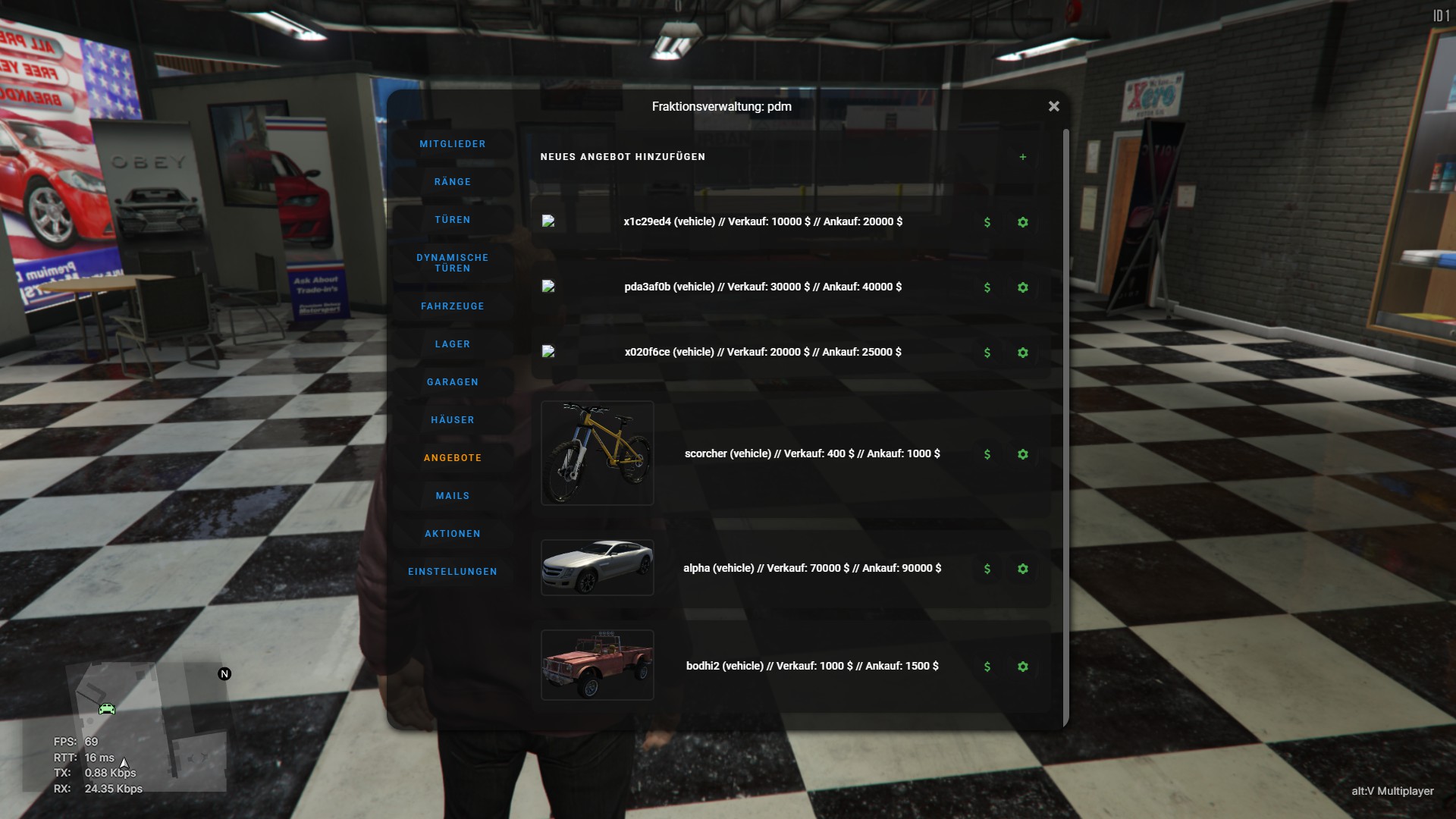 Auch die Autohäuser sind Teil unserer Gebäude-API: Das heißt konkret, dass sie direkt zur Laufzeit einer Fraktion zugewiesen werden können. Somit kann eine angemeldete Firma ein entsprechendes Grundstück beantragen und erhält anschließend Zugriff auf sämtliche Autohaus-Funktionen, die mit diesem Gebäude einhergehen. Dazu gehören ebenfalls drei Garagen, welche direkt mit den Katalogfunktionen verbunden sind - Die Fahrzeuge können demnach durch alle befugten Spieler der Fraktion verkauft werden. Das ermöglicht das problemlose Konfigurieren der Katalog-Items. Die Preise können im Fraktionsmenü eingestellt werden.